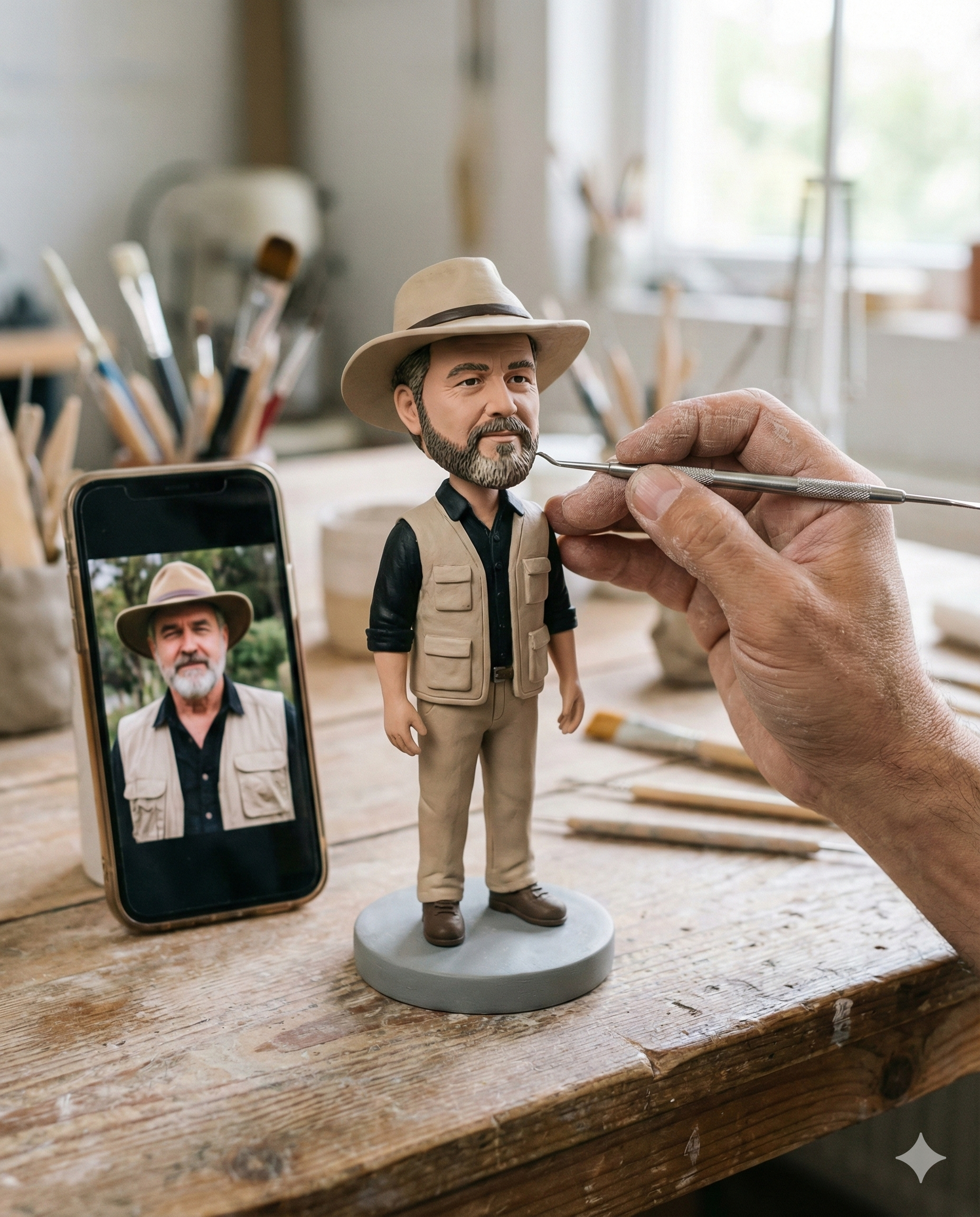 Wählst du die Option mit der Vorschau, erhältst du ein Foto der modellierten Figur per E-Mail. Du kannst uns dann einmalig dein Feedback geben (z.B. 'Nase etwas schmaler'). Unsere Künstler setzen deine Wünsche um, finalisieren die Figur und schicken sie direkt zu dir auf die Reise.